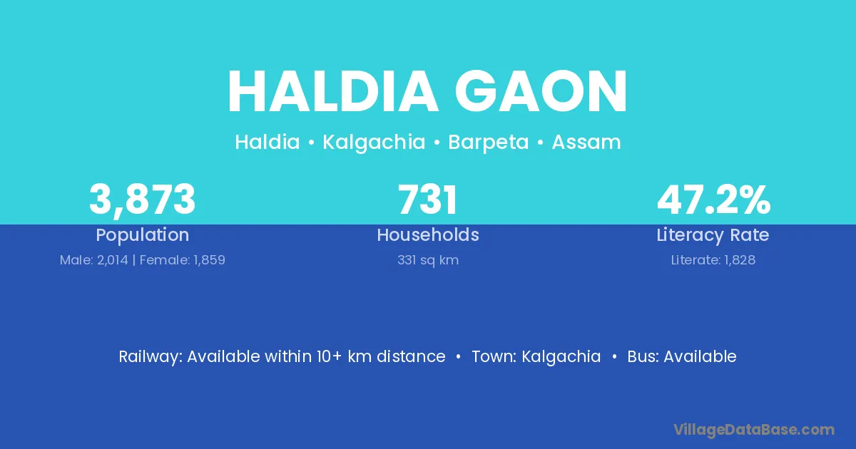 Haldia Gaon village has a total population of 3,873 people, of which 2,014 are males and 1,859 are females.