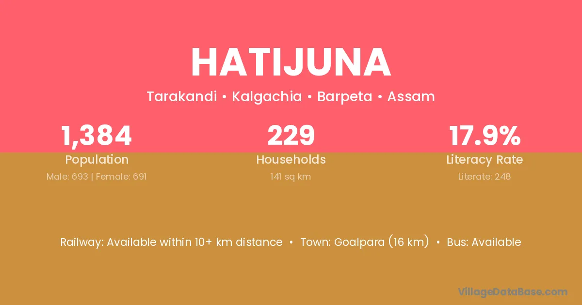 Goalpara (16 km) is the nearest town to Hatijuna village for major economic activities and is located approximately 16 km away.