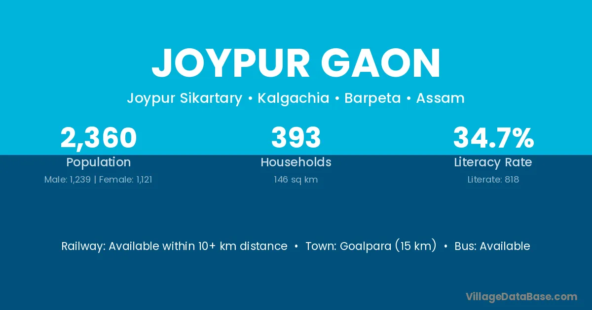 Goalpara (15 km) is the nearest town to Joypur Gaon village for major economic activities and is located approximately 15 km away.