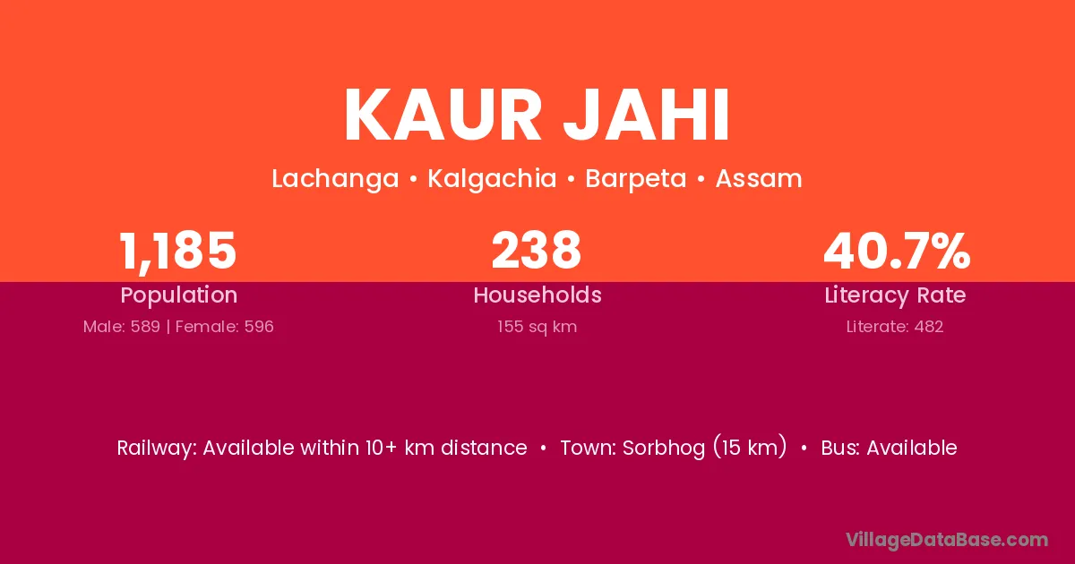 Sorbhog (15 km) is the nearest town to Kaur Jahi village for major economic activities and is located approximately 15 km away.