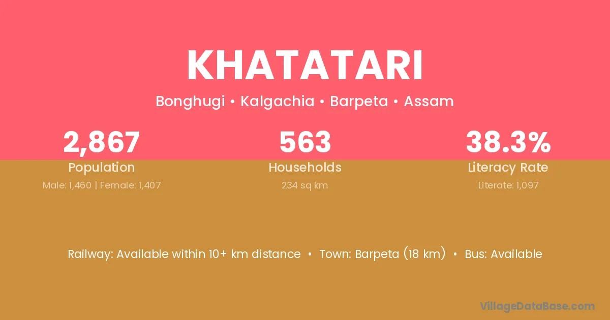 Barpeta (18 km) is the nearest town to Khatatari village for major economic activities and is located approximately 18 km away.