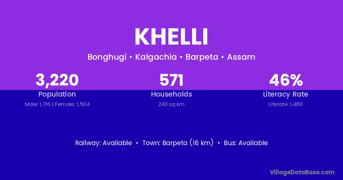 Barpeta (16 km) is the nearest town to Khelli village for major economic activities and is located approximately 16 km away.