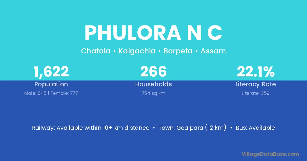 Goalpara (12 km) is the nearest town to Phulora N C village for major economic activities and is located approximately 12 km away.