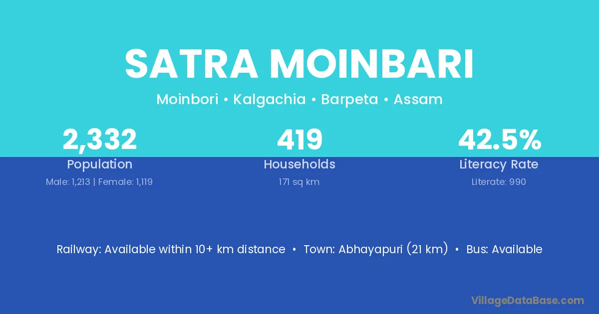 Abhayapuri (21 km) is the nearest town to Satra Moinbari village for major economic activities and is located approximately 21 km away.