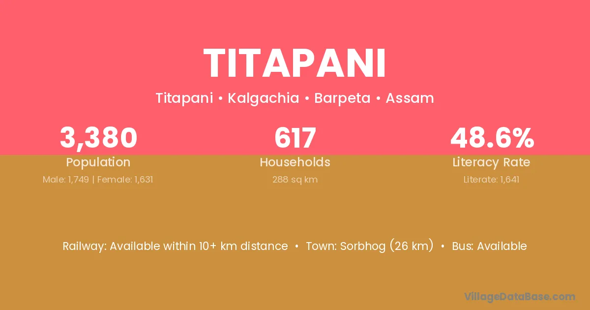 Sorbhog (26 km) is the nearest town to Titapani village for major economic activities and is located approximately 26 km away.