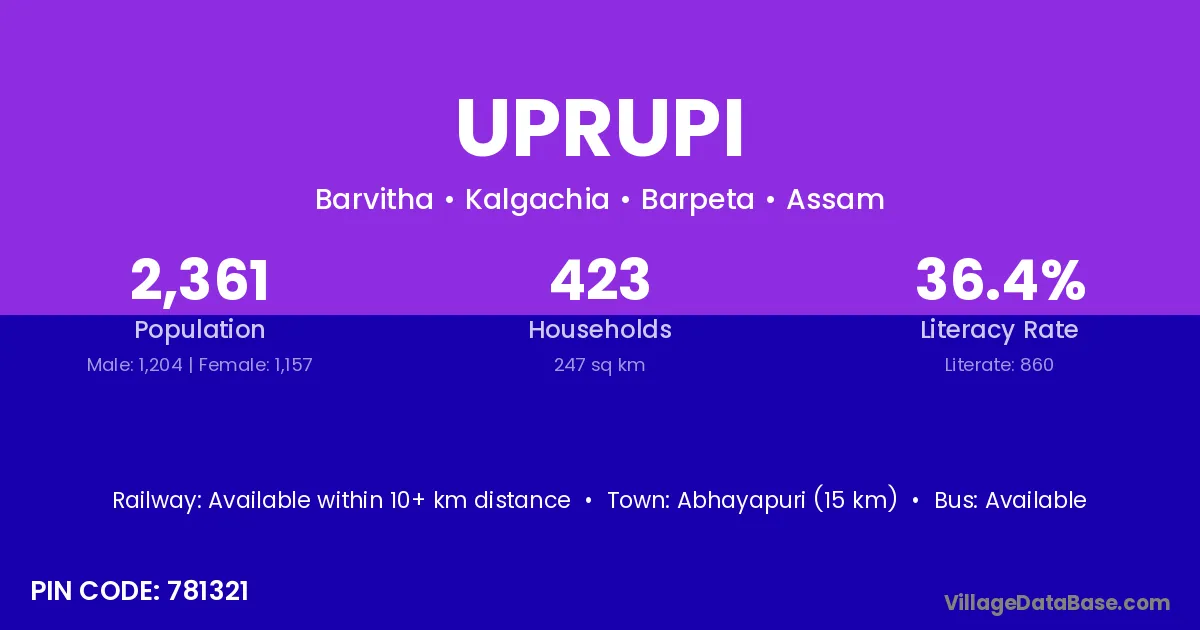 Abhayapuri (15 km) is the nearest town to Uprupi village for major economic activities and is located approximately 15 km away.