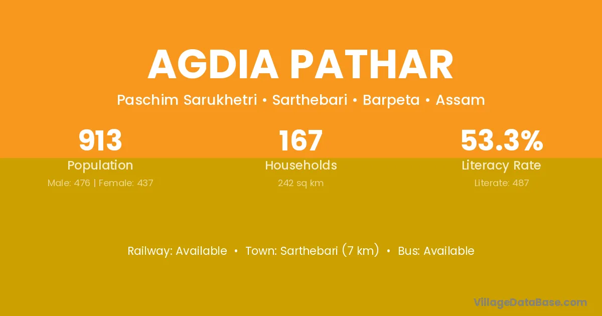 Sarthebari (7 km) is the nearest town to Agdia Pathar village for major economic activities and is located approximately 7 km away.