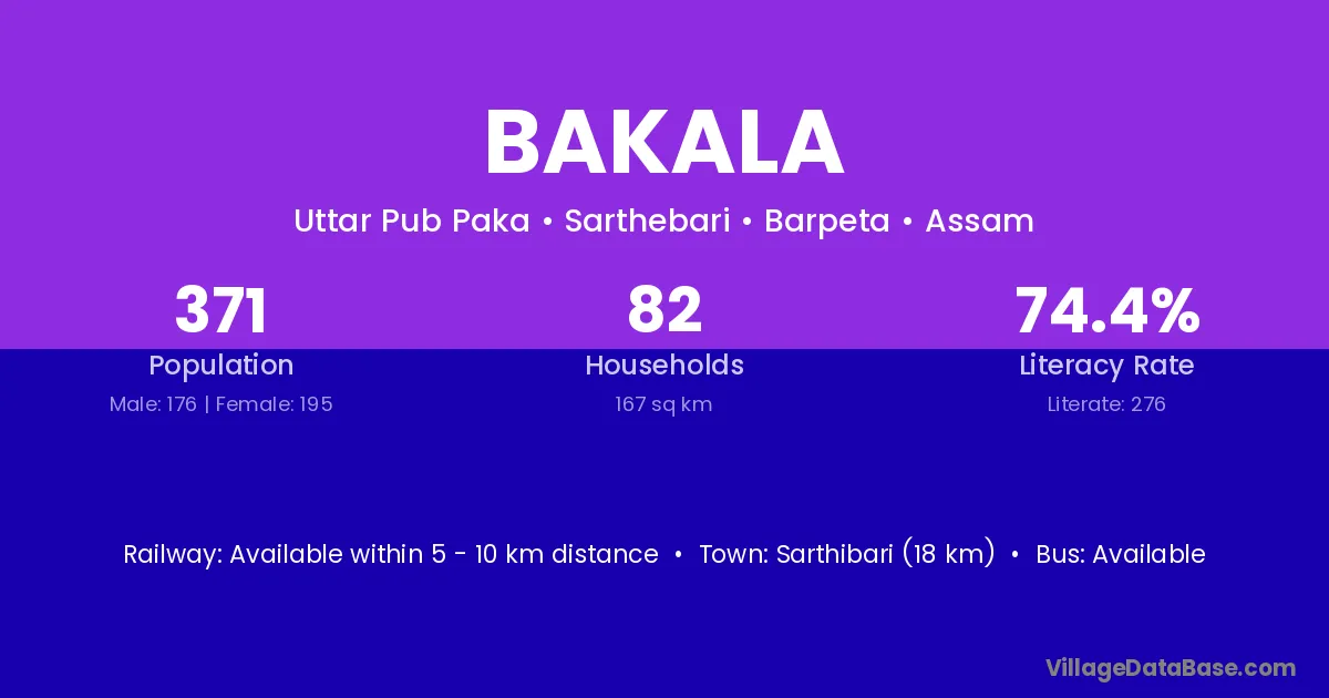 Sarthibari (18 km) is the nearest town to Bakala village for major economic activities and is located approximately 18 km away.