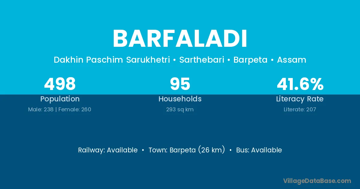 Barpeta (26 km) is the nearest town to Barfaladi village for major economic activities and is located approximately 26 km away.