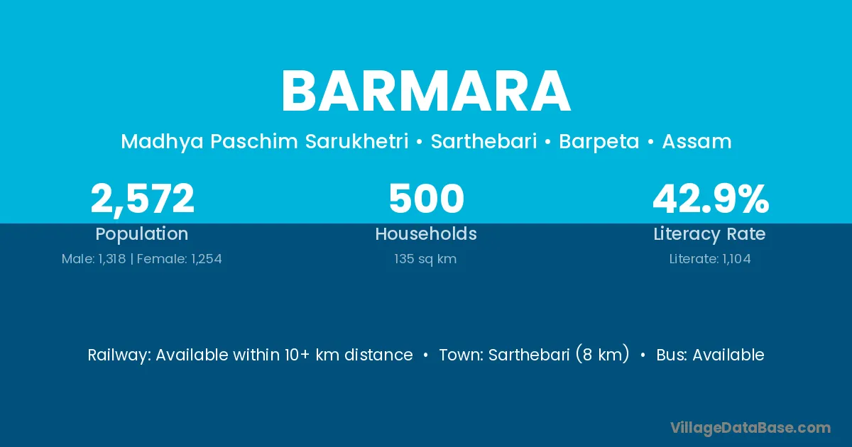 Sarthebari (8 km) is the nearest town to Barmara village for major economic activities and is located approximately 8 km away.
