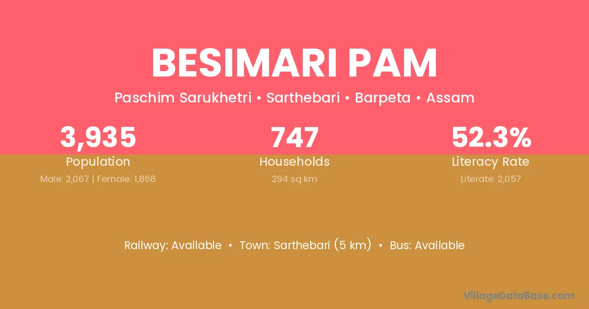 Sarthebari (5 km) is the nearest town to Besimari Pam village for major economic activities and is located approximately 5 km away.