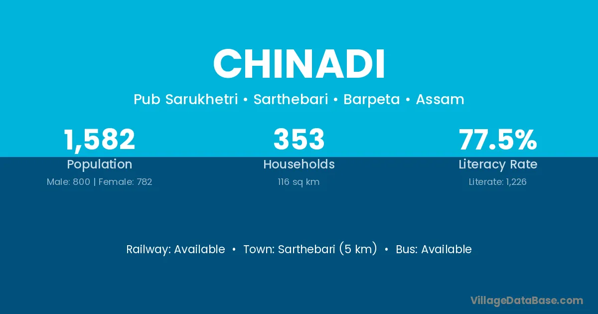 Sarthebari (5 km) is the nearest town to Chinadi village for major economic activities and is located approximately 5 km away.