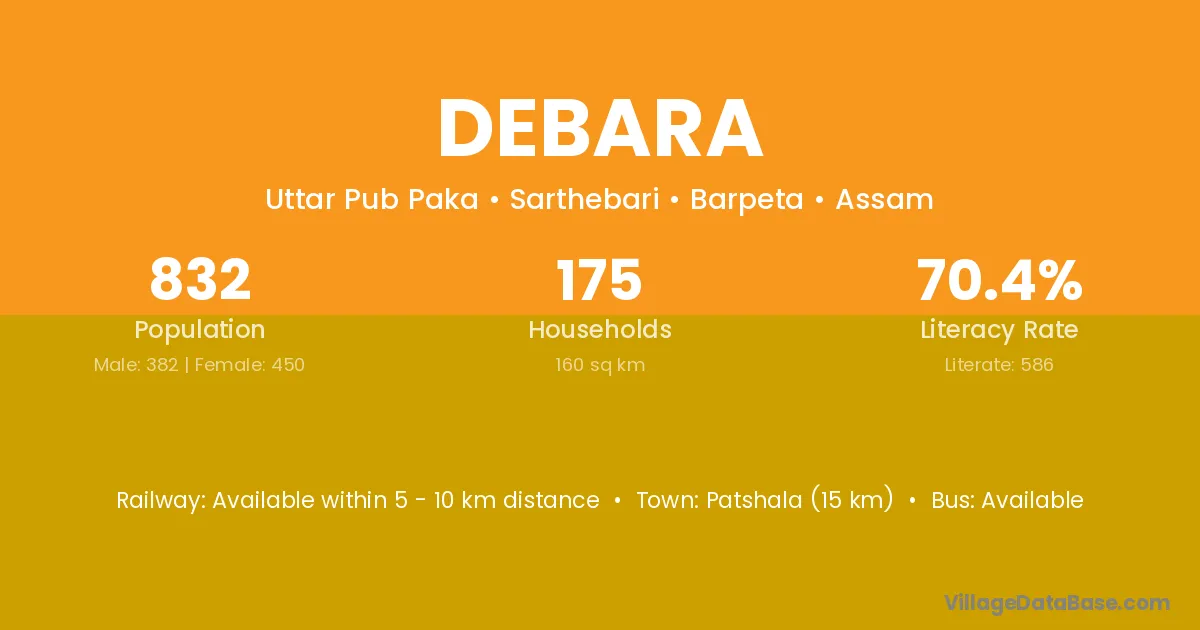 Patshala (15 km) is the nearest town to Debara village for major economic activities and is located approximately 15 km away.