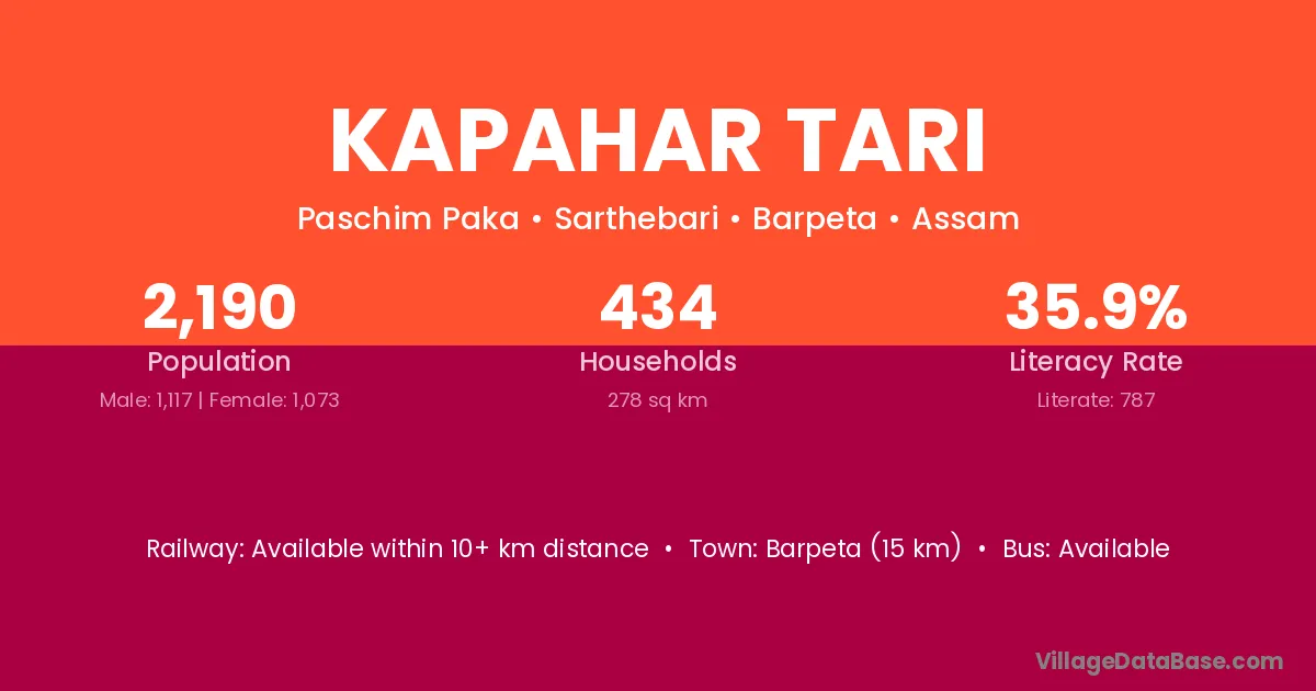 Barpeta (15 km) is the nearest town to Kapahar Tari village for major economic activities and is located approximately 15 km away.