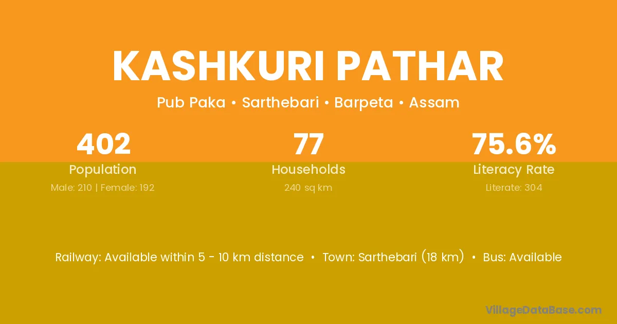 Sarthebari (18 km) is the nearest town to Kashkuri Pathar village for major economic activities and is located approximately 18 km away.