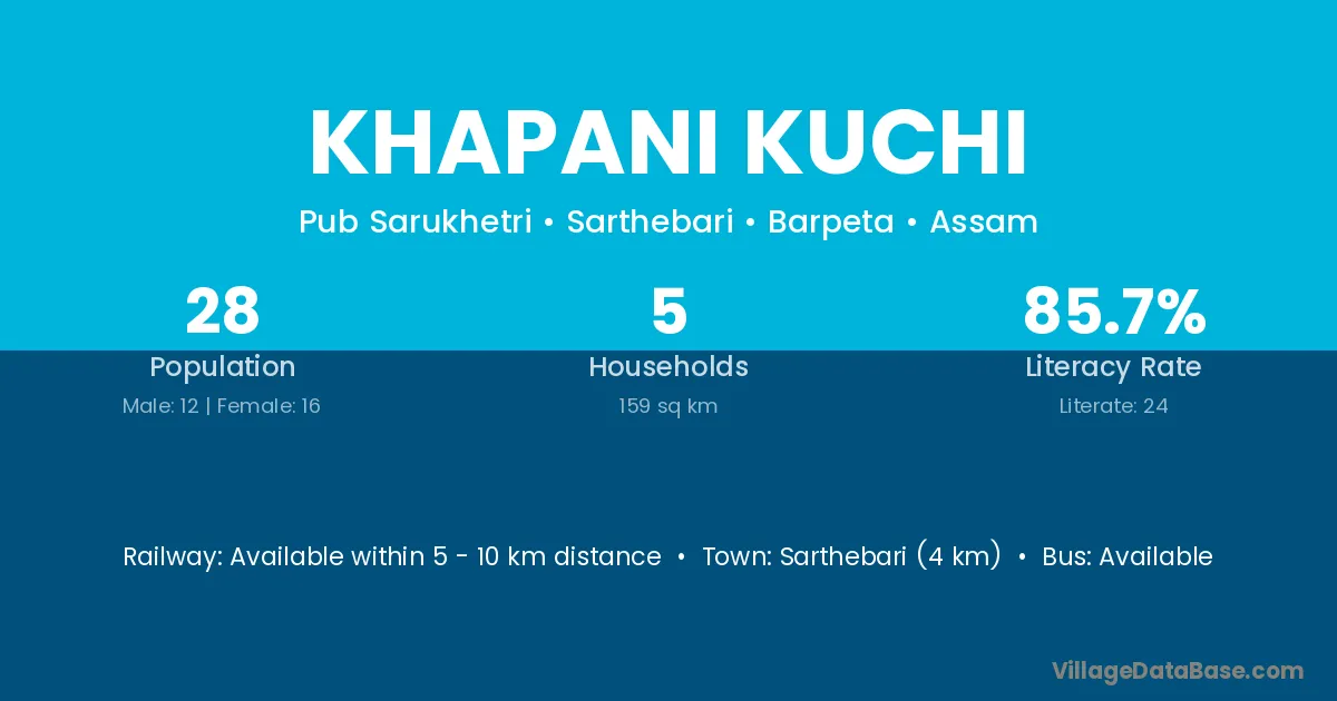 Sarthebari (4 km) is the nearest town to Khapani Kuchi village for major economic activities and is located approximately 4 km away.