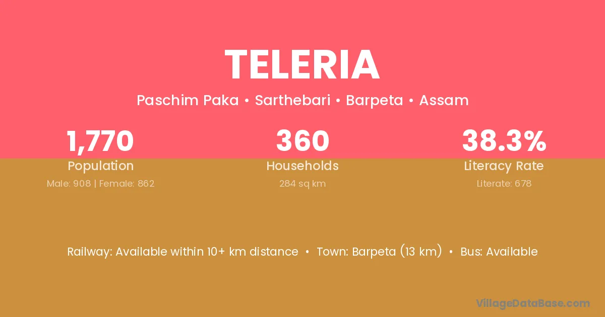Barpeta (13 km) is the nearest town to Teleria village for major economic activities and is located approximately 13 km away.