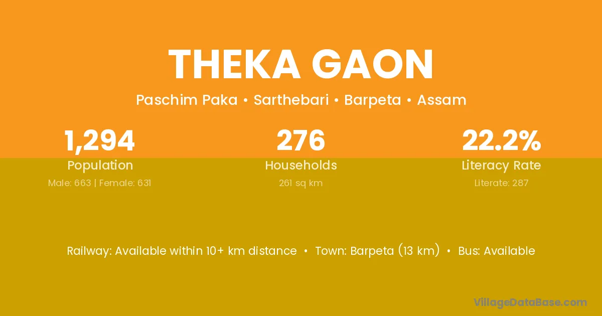 Theka Gaon village has a total population of 1,294 people, of which 663 are males and 631 are females.