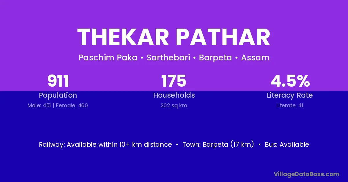 Barpeta (17 km) is the nearest town to Thekar Pathar village for major economic activities and is located approximately 17 km away.