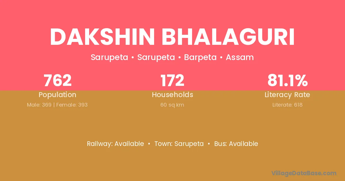 Dakshin Bhalaguri village has a total population of 762 people, of which 369 are males and 393 are females.