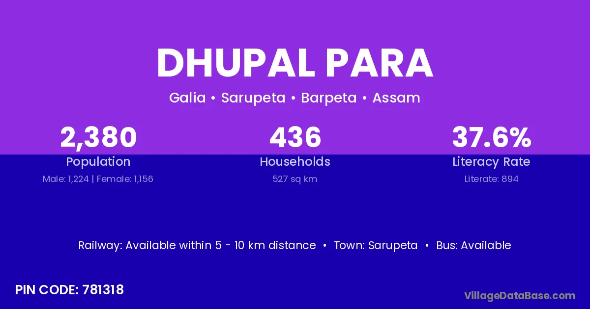 Sarupeta is the nearest town to Dhupal Para village for major economic activities