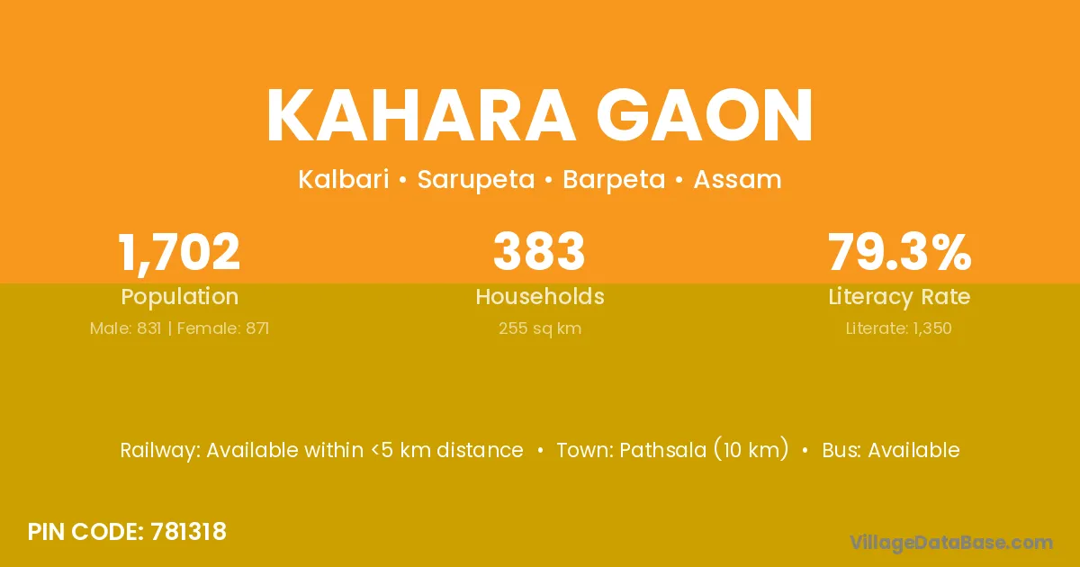 Pathsala (10 km) is the nearest town to Kahara Gaon village for major economic activities and is located approximately 10 km away.