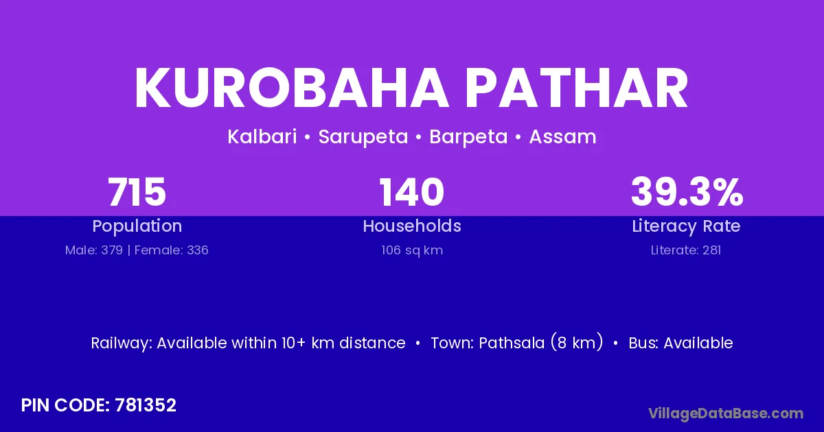 Pathsala (8 km) is the nearest town to Kurobaha Pathar village for major economic activities and is located approximately 8 km away.