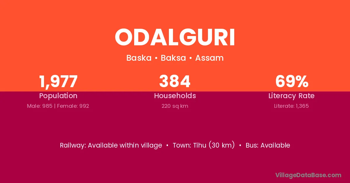 Pathsala (8 km) is the nearest town to Odalguri village for major economic activities and is located approximately 8 km away.