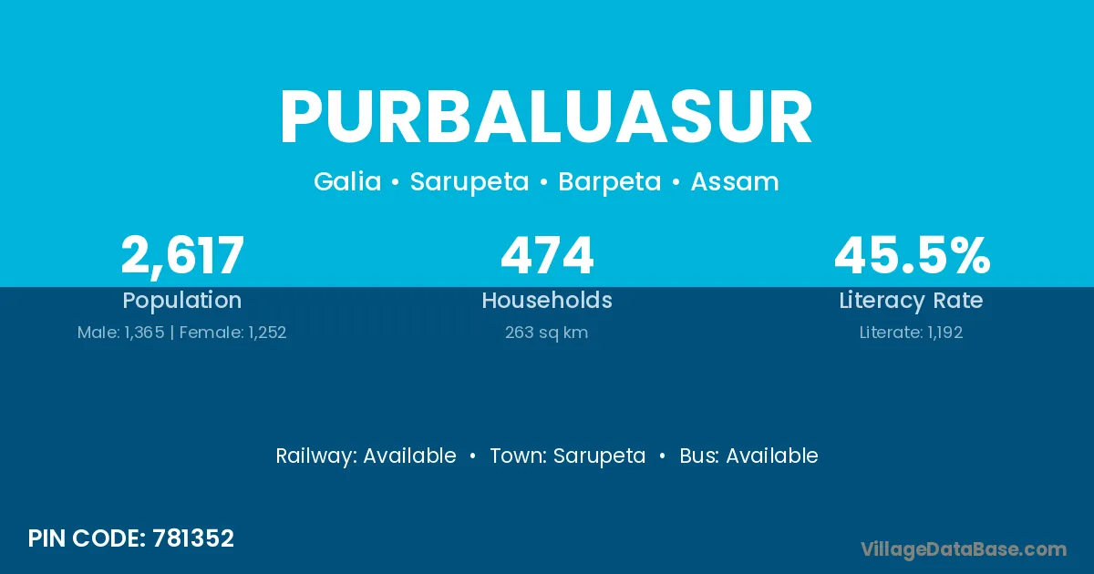 Sarupeta is the nearest town to Purbaluasur village for major economic activities