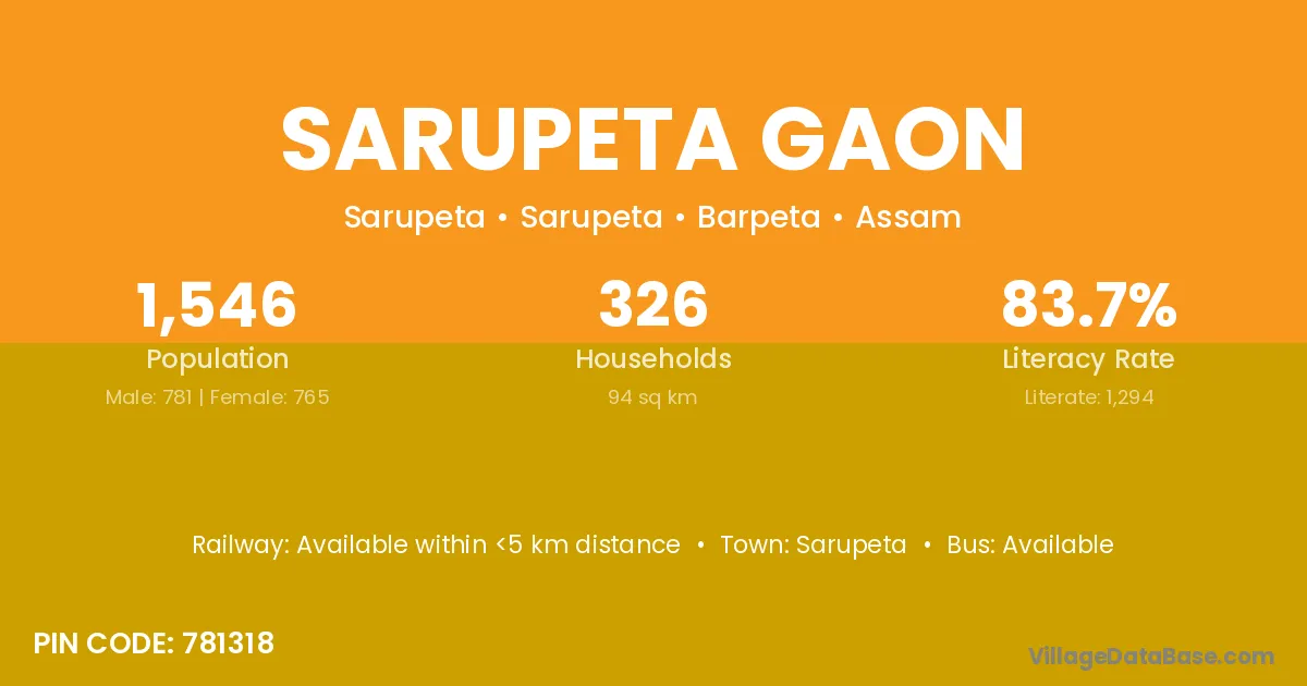 Sarupeta Gaon village has a total population of 1,546 people, of which 781 are males and 765 are females.