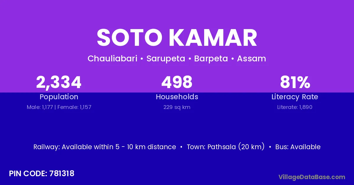 Pathsala (20 km) is the nearest town to Soto Kamar village for major economic activities and is located approximately 20 km away.