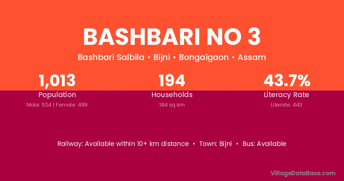 Bashbari No 3 village has a total population of 1,013 people, of which 524 are males and 489 are females.