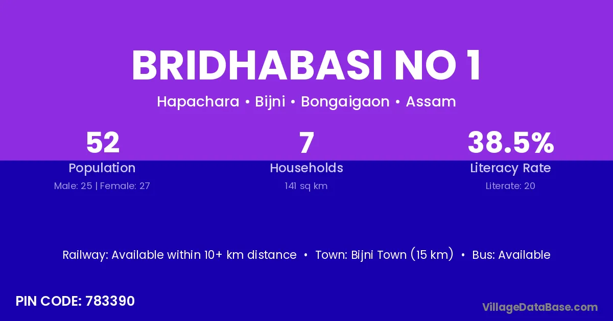 Bijni Town (15 km) is the nearest town to Bridhabasi No 1 village for major economic activities and is located approximately 15 km away.