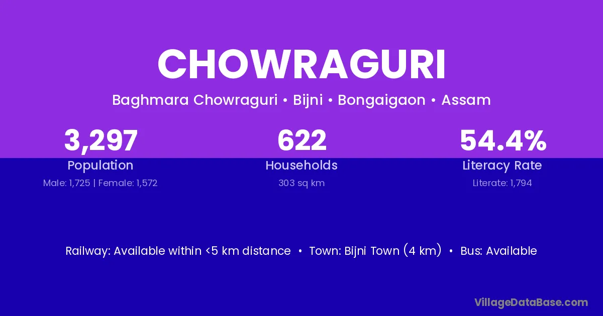 Bijni Town (4 km) is the nearest town to Chowraguri village for major economic activities and is located approximately 4 km away.