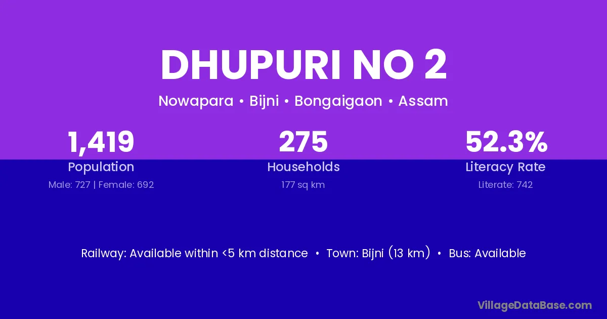Bijni (13 km) is the nearest town to Dhupuri No 2 village for major economic activities and is located approximately 13 km away.