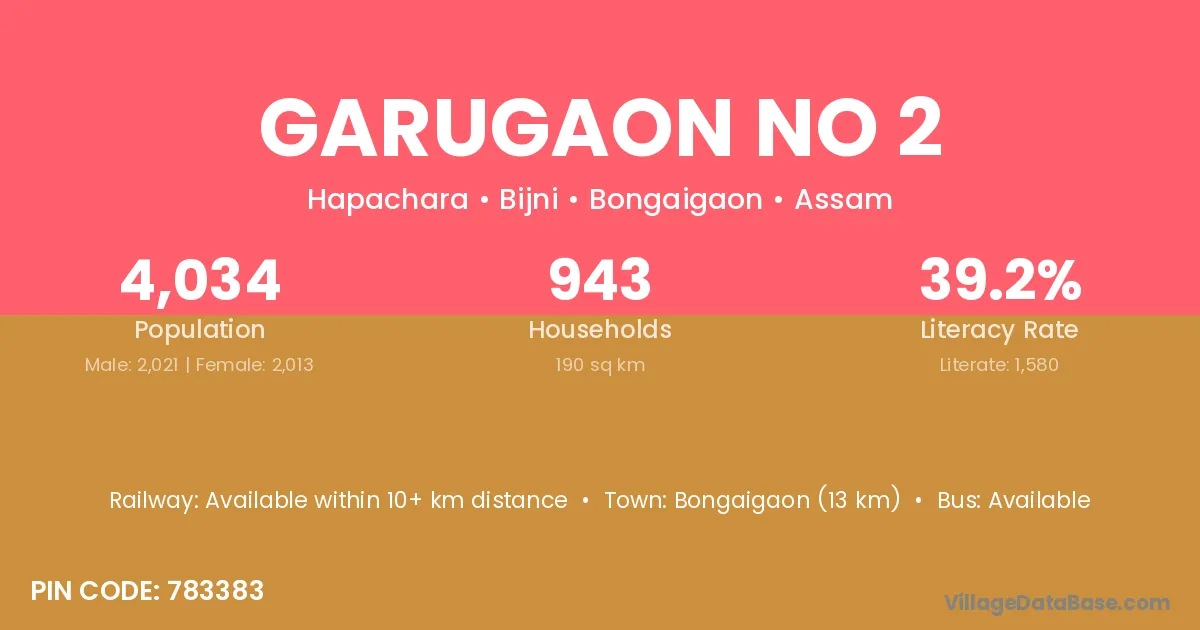 Bongaigaon (13 km) is the nearest town to Garugaon No 2 village for major economic activities and is located approximately 13 km away.