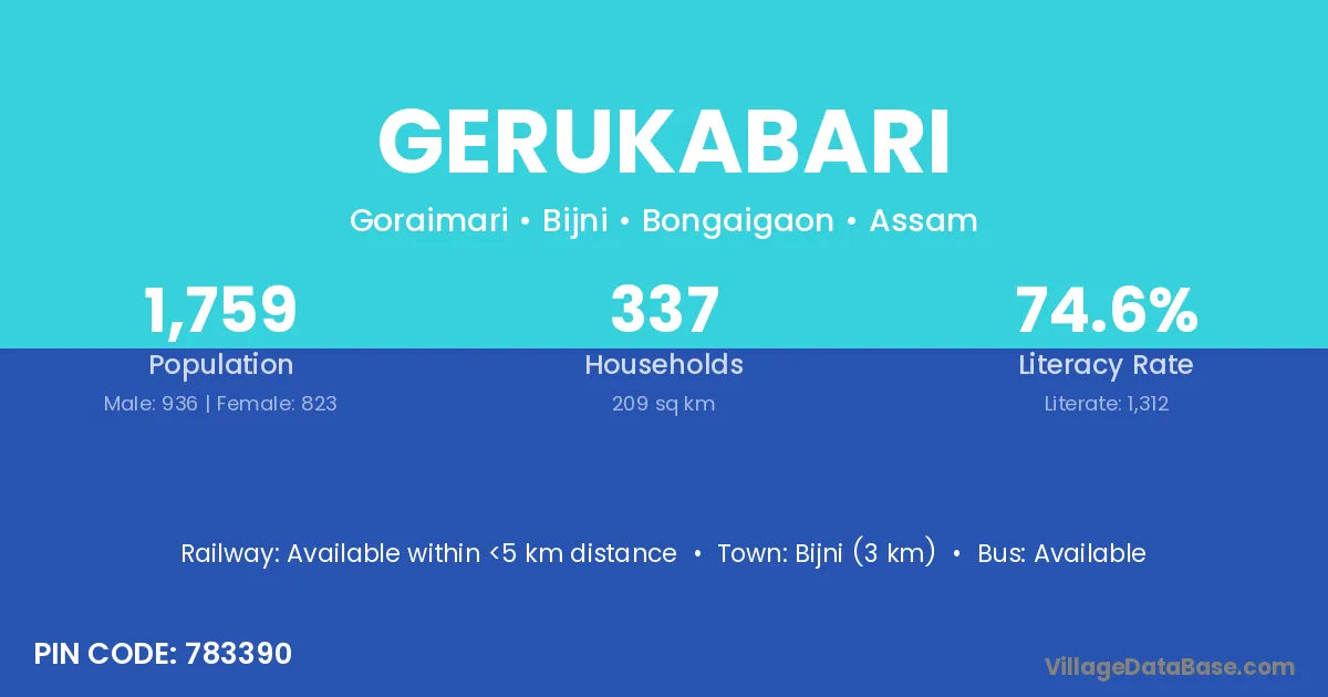Bijni (3 km) is the nearest town to Gerukabari village for major economic activities and is located approximately 3 km away.