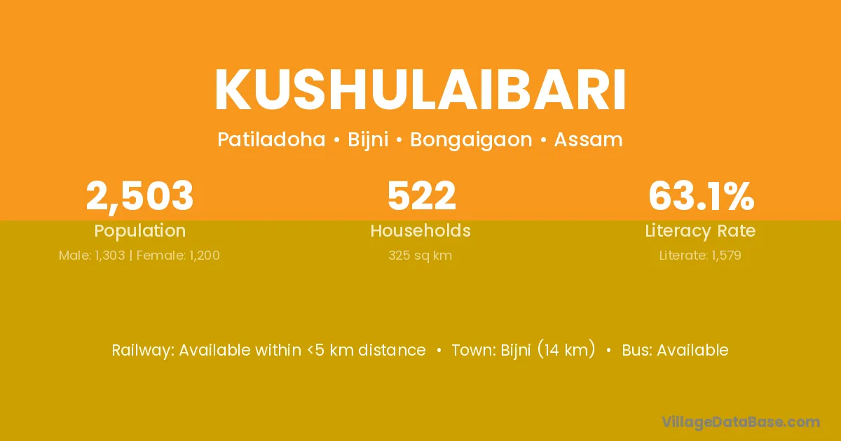Bijni (14 km) is the nearest town to Kushulaibari village for major economic activities and is located approximately 14 km away.