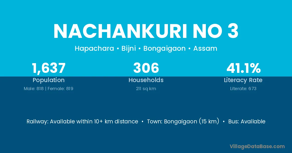 Bongaigaon (15 km) is the nearest town to Nachankuri No 3 village for major economic activities and is located approximately 15 km away.
