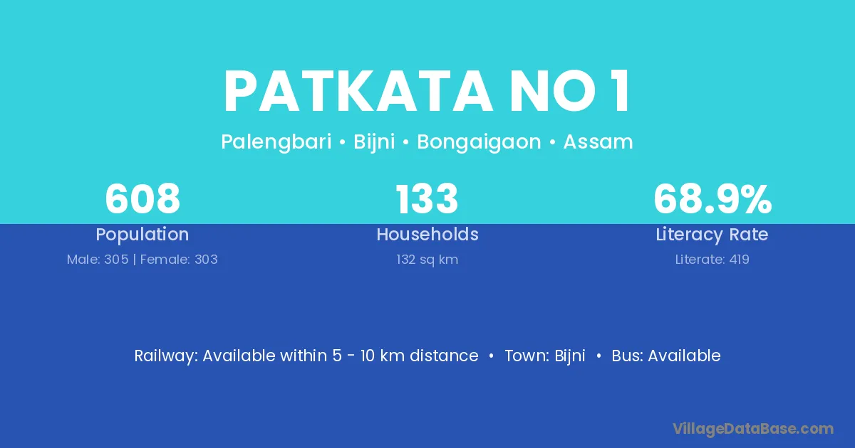 Patkata No 1 village has a total population of 608 people, of which 305 are males and 303 are females.