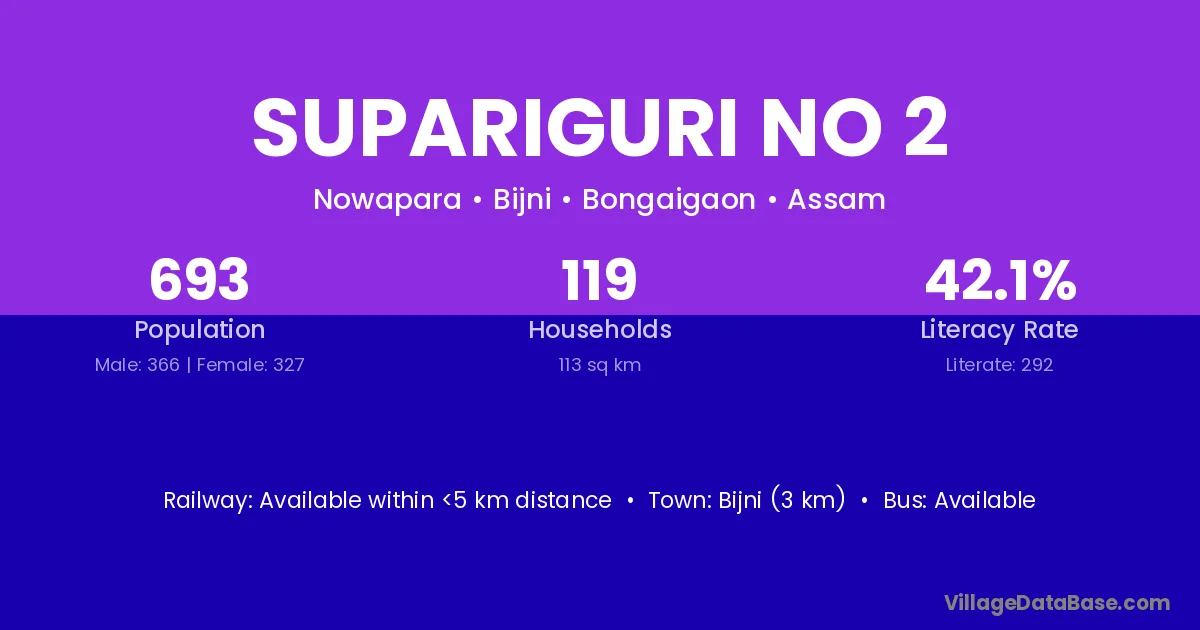 Bijni (3 km) is the nearest town to Supariguri No 2 village for major economic activities and is located approximately 3 km away.