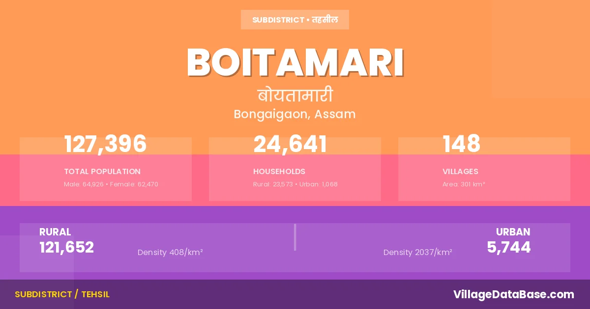 Boitamari is a town and Subdivision in the Bongaigaon district of the Assam. In India, a Subdivision is a subdivision of a district responsible for the administration and revenue collection of a specific area within the district. Subdivisions play a crucial role in the local governance structure, contributing significantly to the development and administration of their communities.
