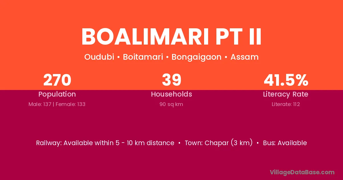 Boalimari Pt Ii village has a total population of 270 people, of which 137 are males and 133 are females.