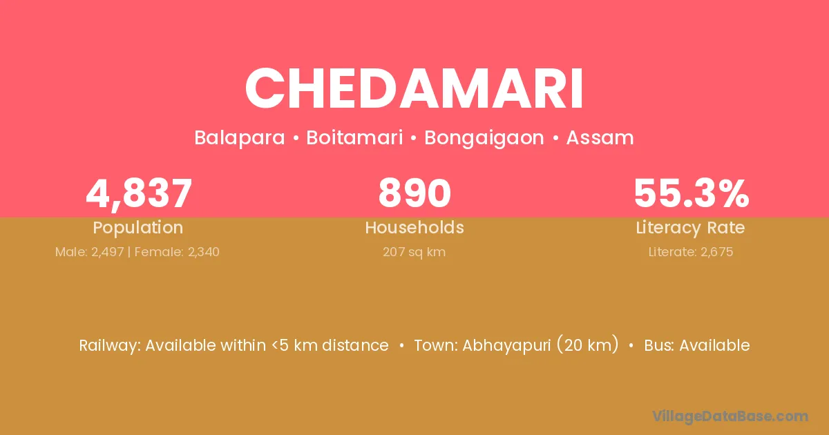 Abhayapuri (20 km) is the nearest town to Chedamari village for major economic activities and is located approximately 20 km away.