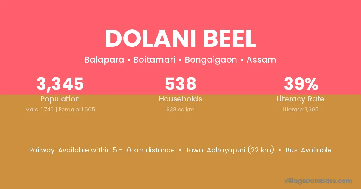Abhayapuri (22 km) is the nearest town to Dolani Beel village for major economic activities and is located approximately 22 km away.