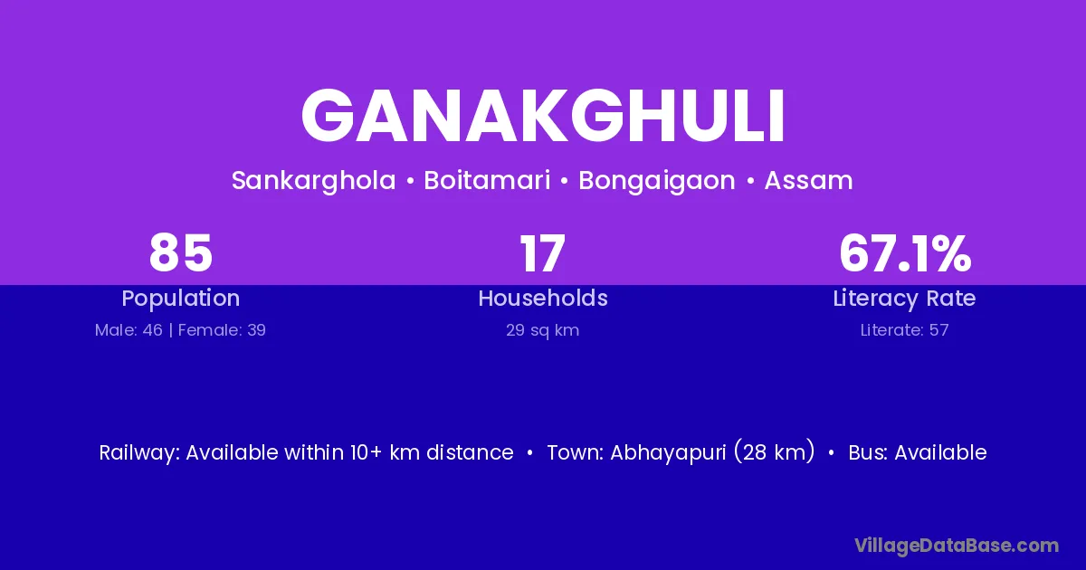 Abhayapuri (28 km) is the nearest town to Ganakghuli village for major economic activities and is located approximately 28 km away.