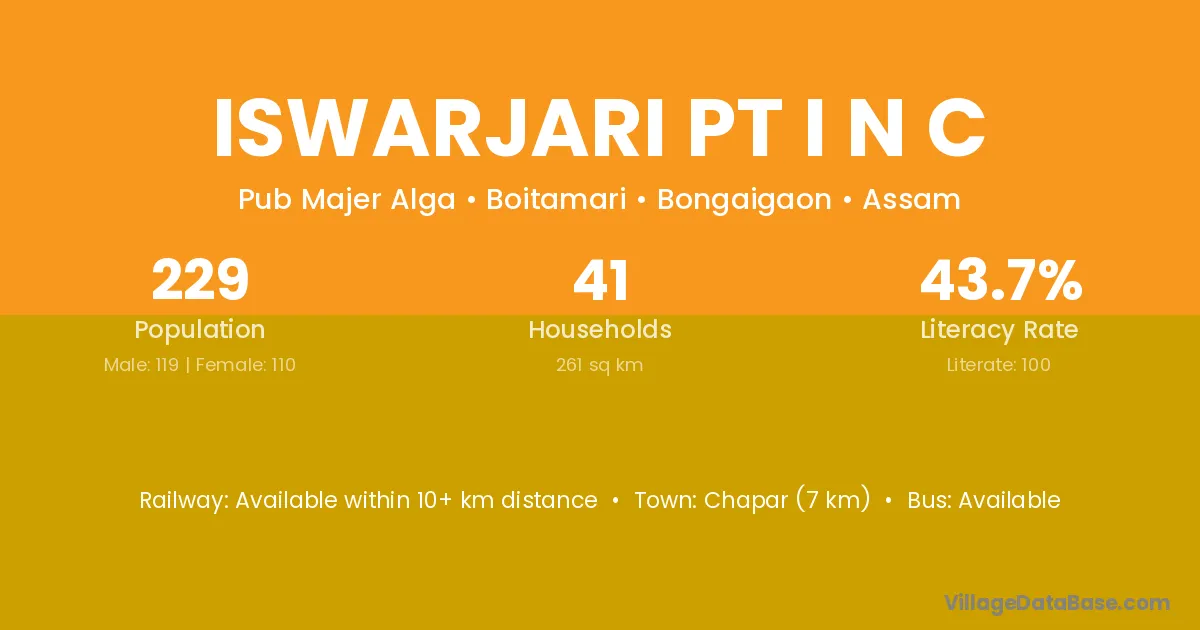 Chapar (7 km) is the nearest town to Iswarjari Pt I N C village for major economic activities and is located approximately 7 km away.