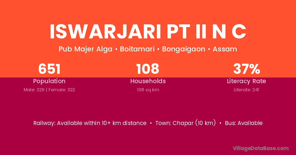 Chapar (10 km) is the nearest town to Iswarjari Pt Ii N C village for major economic activities and is located approximately 10 km away.