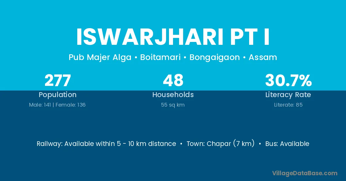 Chapar (7 km) is the nearest town to Iswarjhari Pt I village for major economic activities and is located approximately 7 km away.