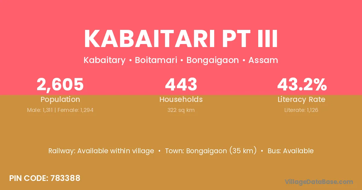 Bongaigaon (35 km) is the nearest town to Kabaitari Pt Iii village for major economic activities and is located approximately 35 km away.